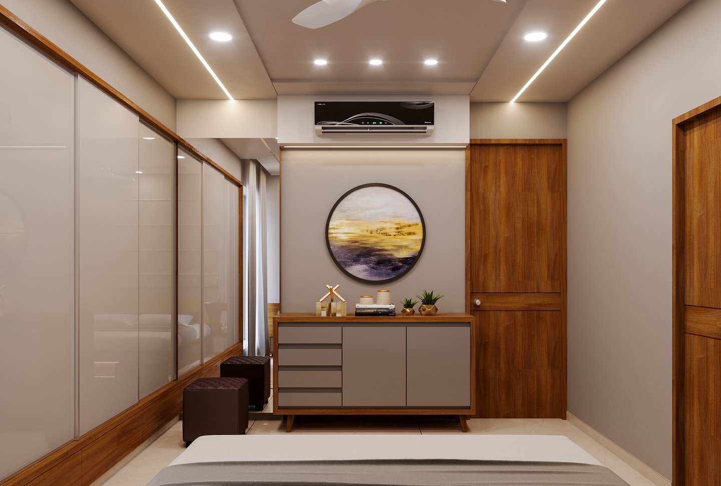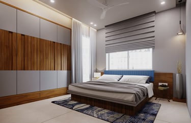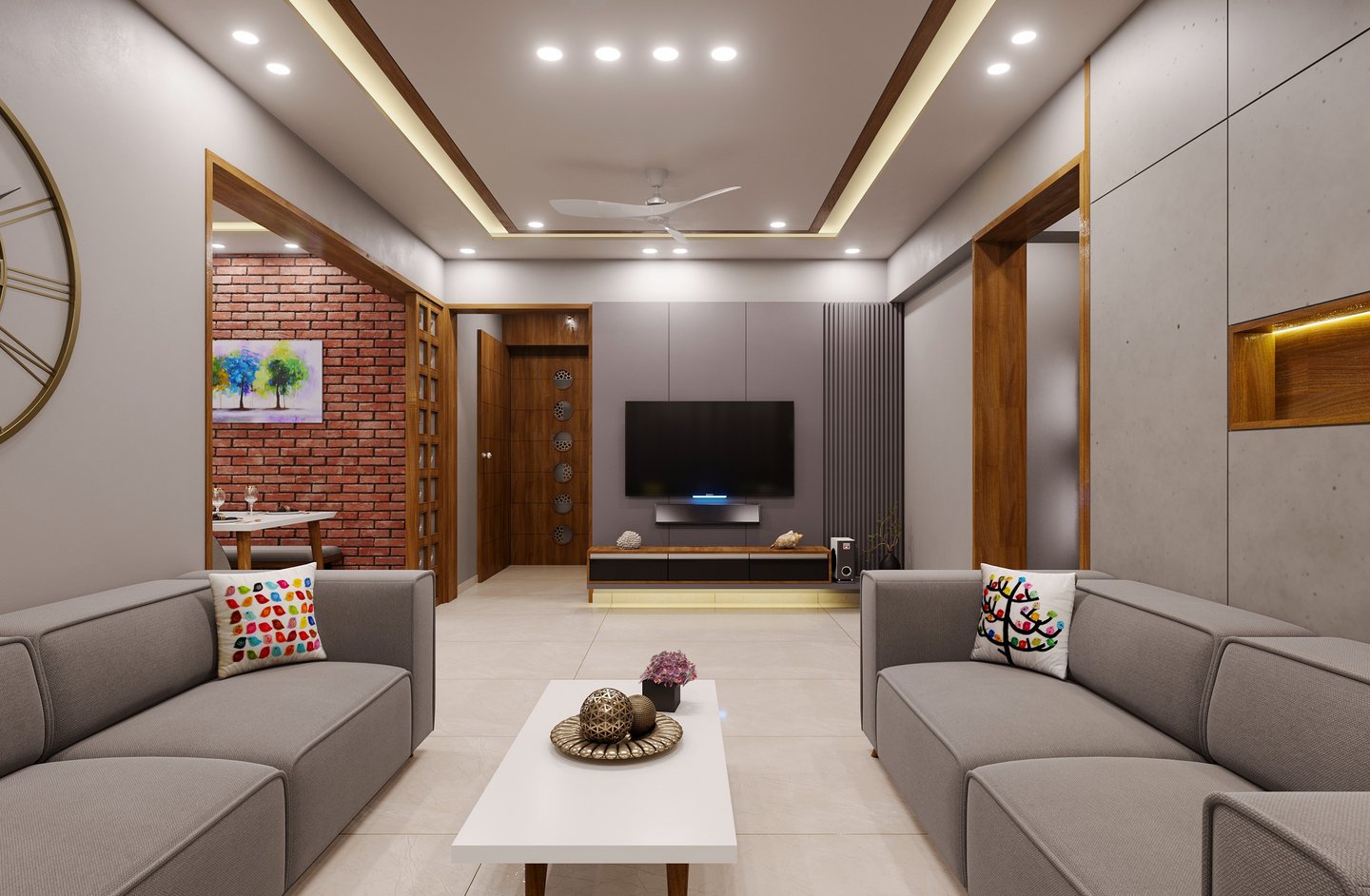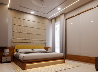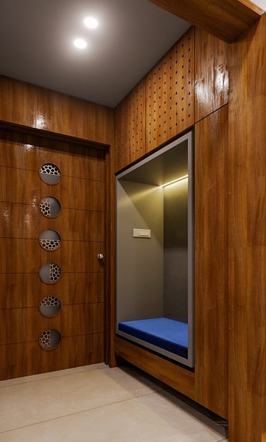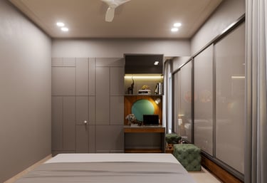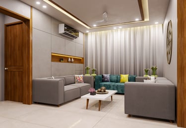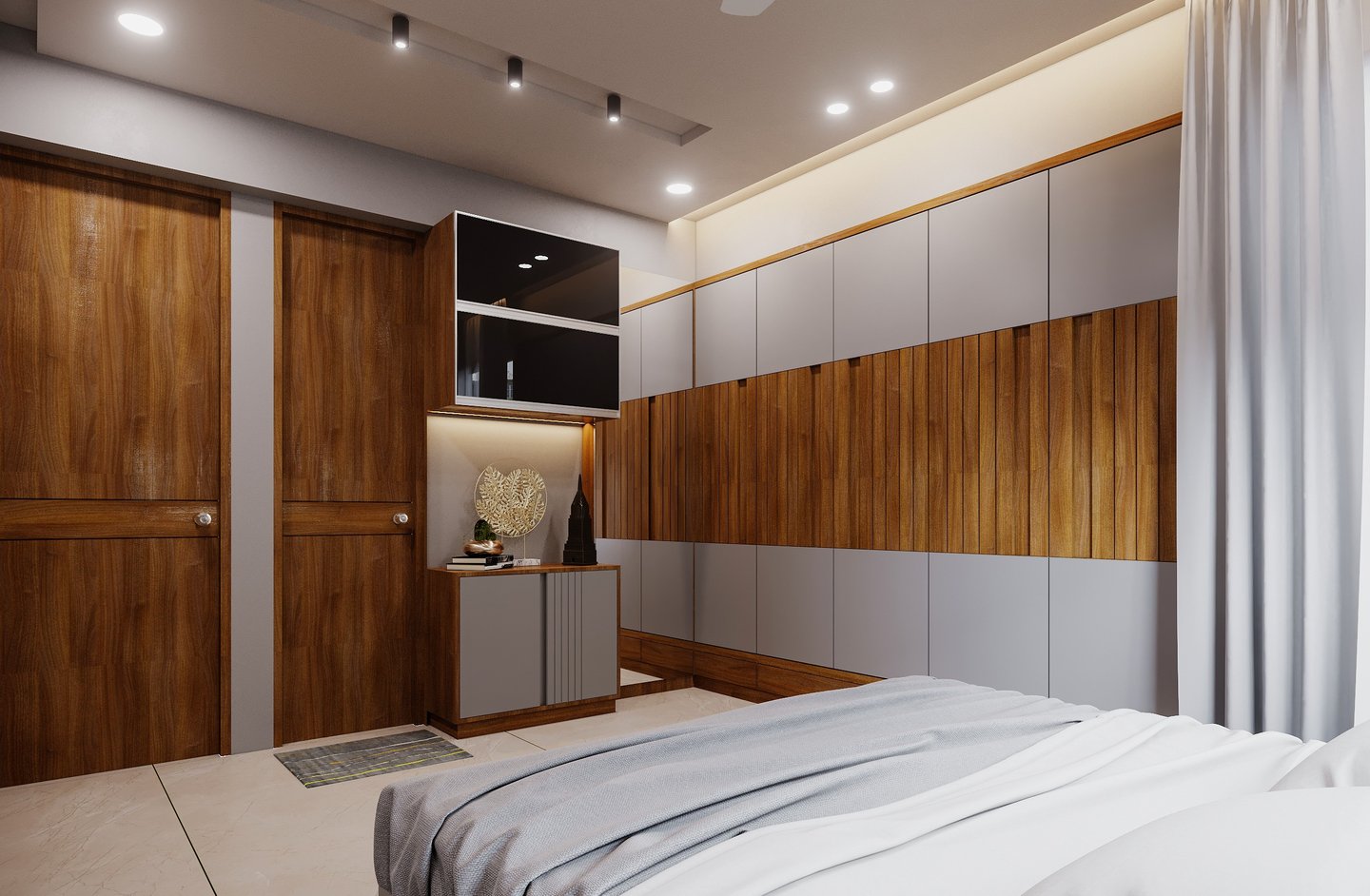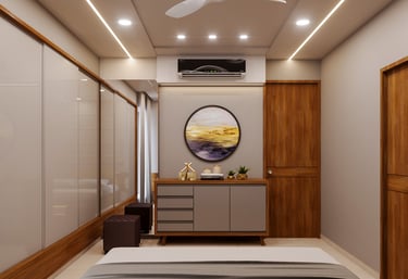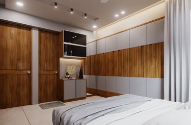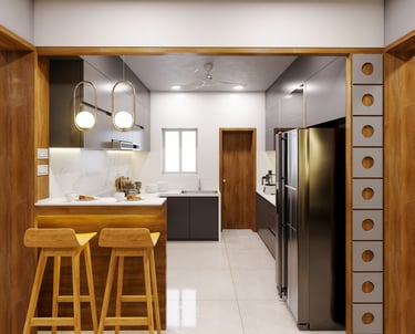 This residence for Mr. Arjun Makadiya in Upleta reflects HV Interior’s signature blend of bold textures, minimal color palettes, and intelligent space utilization. The home embraces earthy wood tones, soft greys, and ambient lighting, creating a warm, welcoming vibe. The living area exudes comfort with its clean-lined sofas and artistic accents, while the kitchen and dining zones flow seamlessly in an open-plan layout. Each bedroom is designed with individual character modern wardrobes, layered lighting, and rich finishes define their ambiance. With a fusion of contemporary aesthetics and functional design, this home delivers comfort, clarity, and quiet luxury at every corner.